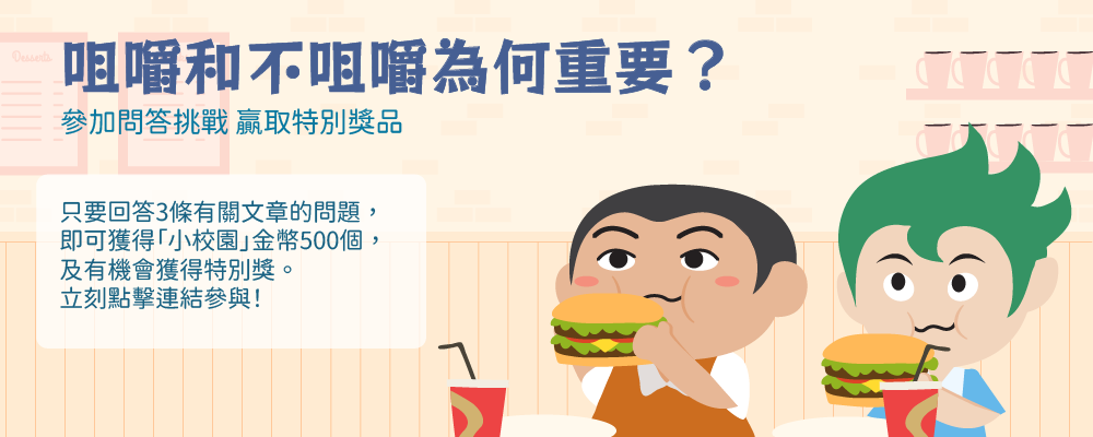 - 只是把食物咬成小塊仍然不足夠,還要嚼爛並與口水混合,變成半液狀的「食團」,才能夠更易沿着食道滑下, 避免噎住。