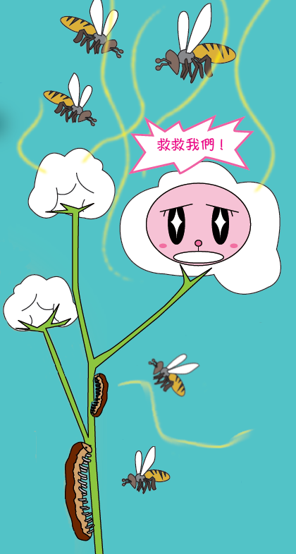被毛蟲攻擊的棉花會向寄生蜂求援。寄生蜂會在毛蟲體內產卵,讓幼蟲寄生並吃掉宿主。