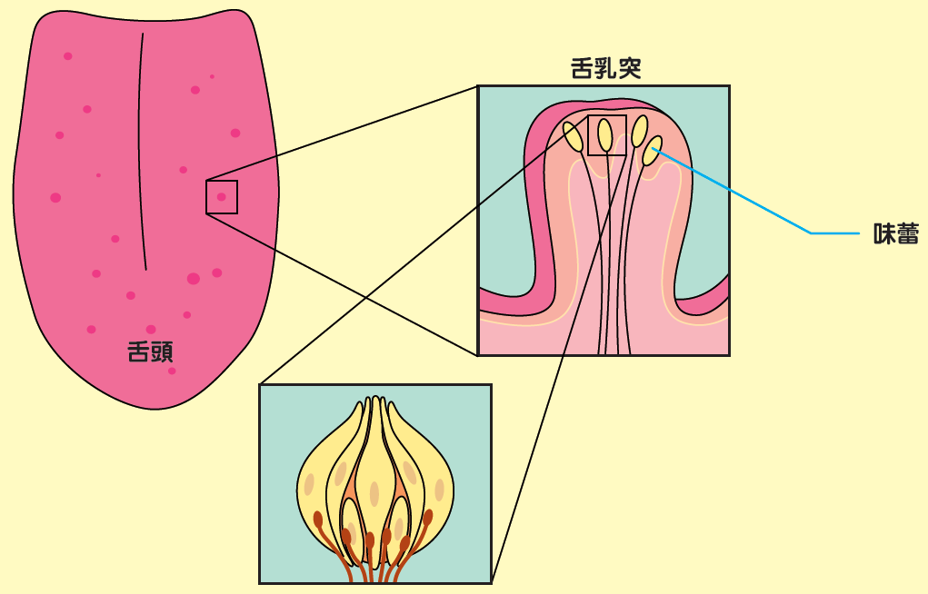 味道是來自味蕾的感覺。如果你對着鏡子伸出舌頭,就會看到舌上有許多突出的點,那些點叫「舌乳突」。