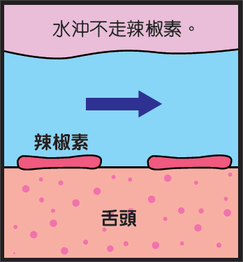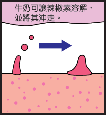 很多人吃辣時都會喝水,但是辣椒素不溶於水。喝水雖然有降溫效果,卻沖不走辣椒素。因為牛奶則含酪蛋白,所以喝全脂牛奶或脫脂奶,都能夠將辣椒素沖走。