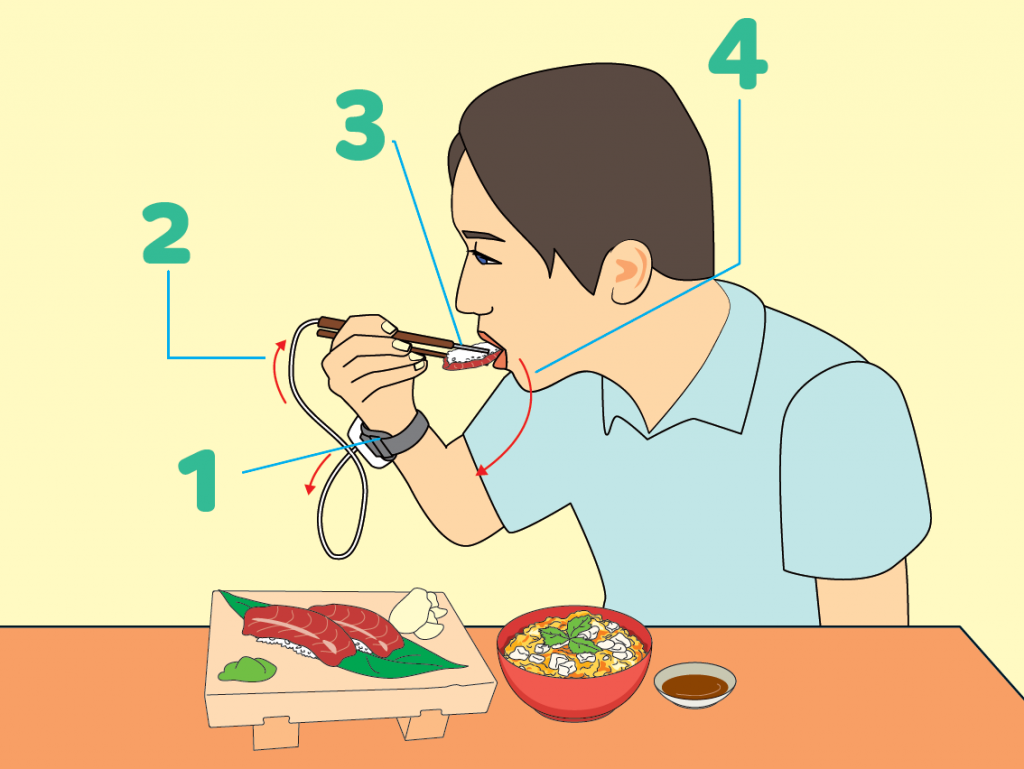 1. 在一個配戴在手腕上的裝置上安裝電源,並發出微弱的電流。