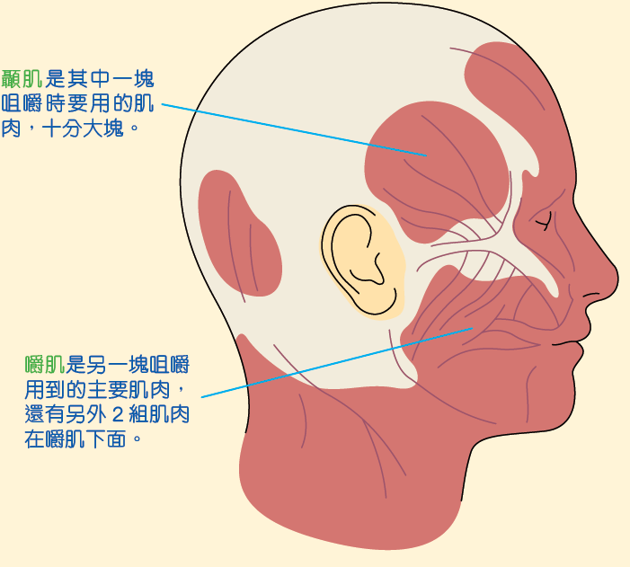 当人们咀嚼时,需要利用面部和面侧多组的肌肉,使下颚上下往复移动,从而令上颚及下颚的牙齿重复碾压食物。