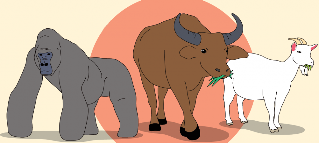 牛、羊、大猩猩等动物则会把食物嚼烂。植物当中的纤维素难以消化,因此草食动物要把食物嚼烂,牠们消化系统才能够有效地把纤维素消化成可吸收的营养,否则吃了也是白吃。