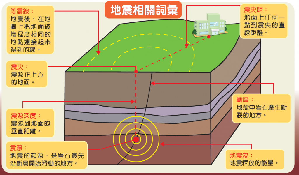 - 震源:地震的起源,是岩石最先沿断层开始滑动的地方。