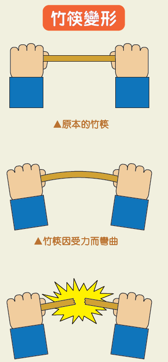 ▲竹筷断裂,由弯曲恢复最初笔直的形状,亦释放出弹性能。