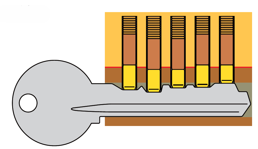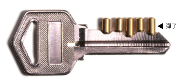 即使是不相配的钥匙,也是有可能插进钥匙孔的,但这个情况下,有些弹子会被推至错误的高度,弹子夹缝到不了截点,平头弹子就会继续卡住锁芯,无法开锁。