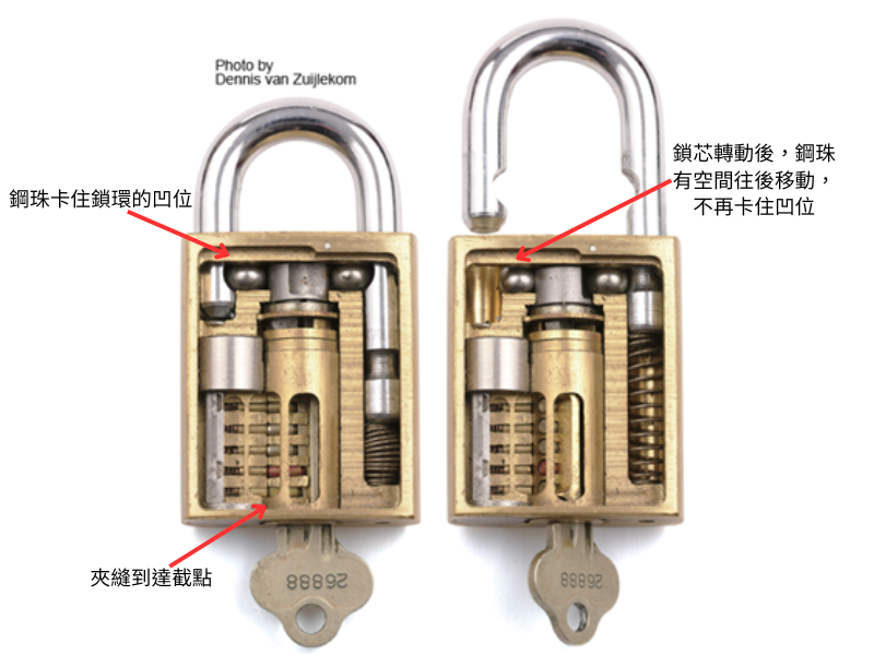 转动锁芯后,上面的钢珠就不会卡住锁环末端的凹位,因此可以解开锁环。(右图)