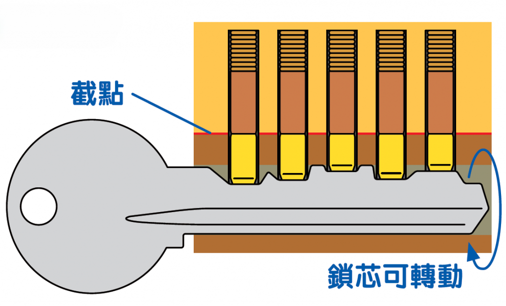 插入钥匙后,可见5条弹子的夹缝都到达截点,对齐形成一条直线。(左图)