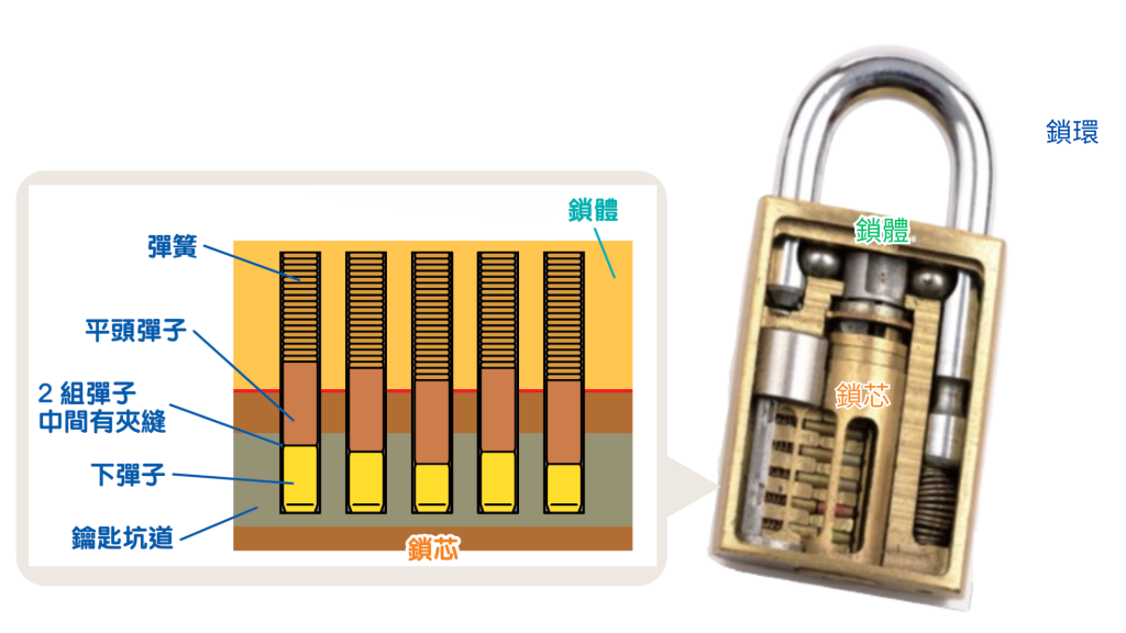 门锁、挂锁也会使用弹子锁这种锁头设计,下面将会用挂锁来展示弹子锁的结构!