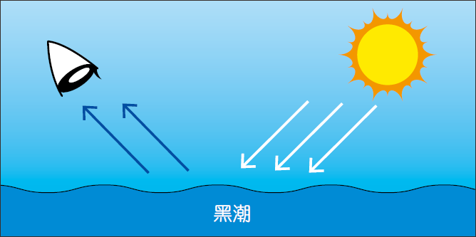 当阳光照射海面时,大多被海水吸收,只有部分波长较短的蓝光被反射,呈现深蓝色。由于与黑色相似而得名「黑潮」。