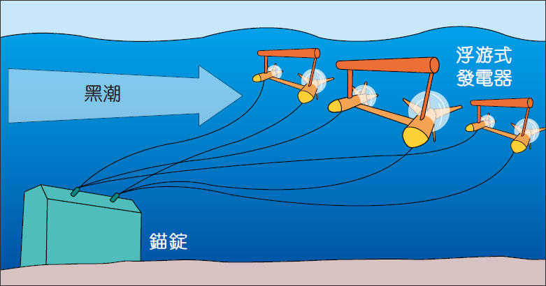 黑潮的水流能驱动发电器的扇叶旋转,从而产生电力。