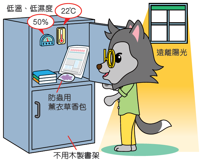 良好的纸张保存环境必须是低温、低湿度,当中的温度和相对湿度最好低于摄氏23°C 及55%,并且远离阳光,配以气味浓烈的香包防虫。此外,木质书架可能会释放伤害纸张的酸性物质,所以存放纸质物品时,应该使用其他材质的书架。