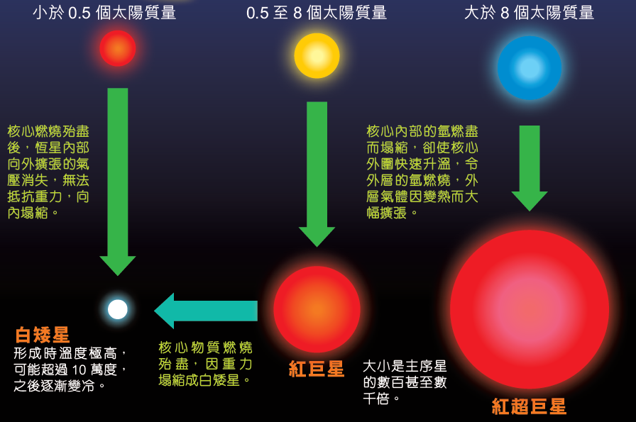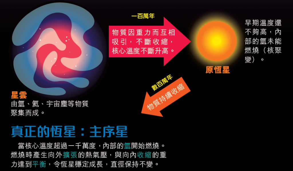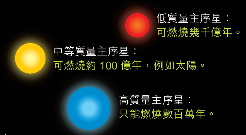 恒星诞生于星云,由「体形」决定命运。恒星愈大,质量也愈大,寿命就愈短。有些巨恒星只要一千万年就会燃烧殆尽,有些矮恒星则能燃烧至一千亿年呢!
