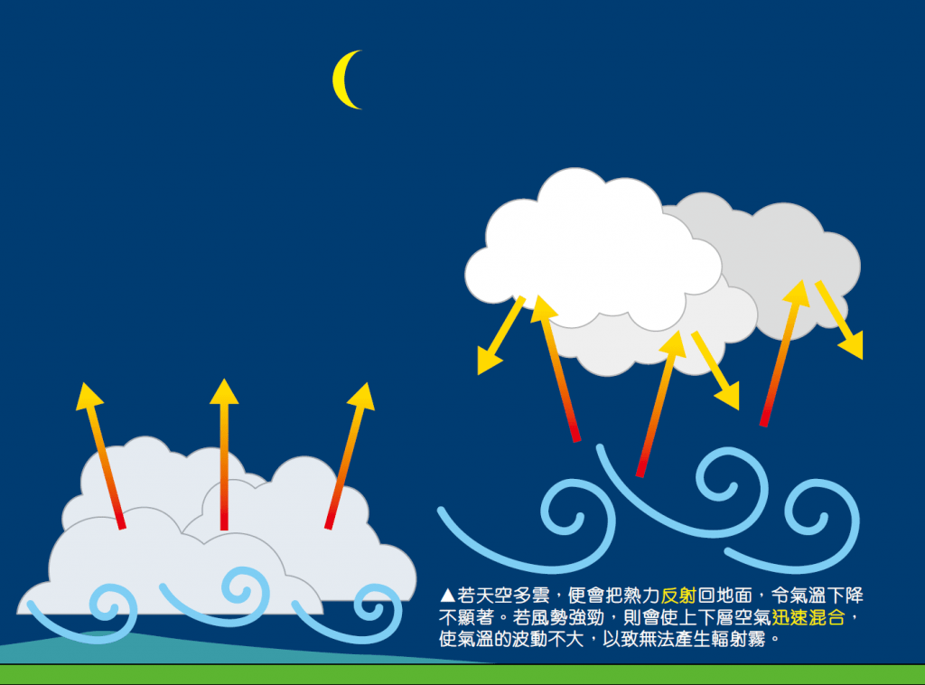 在晚上,地面会把白天吸收来自太阳的热力,以红外线的形式,释放回太空。这个过程称为辐射冷却。地面温度下降,令近地面的水气凝结,便会形成辐射雾。