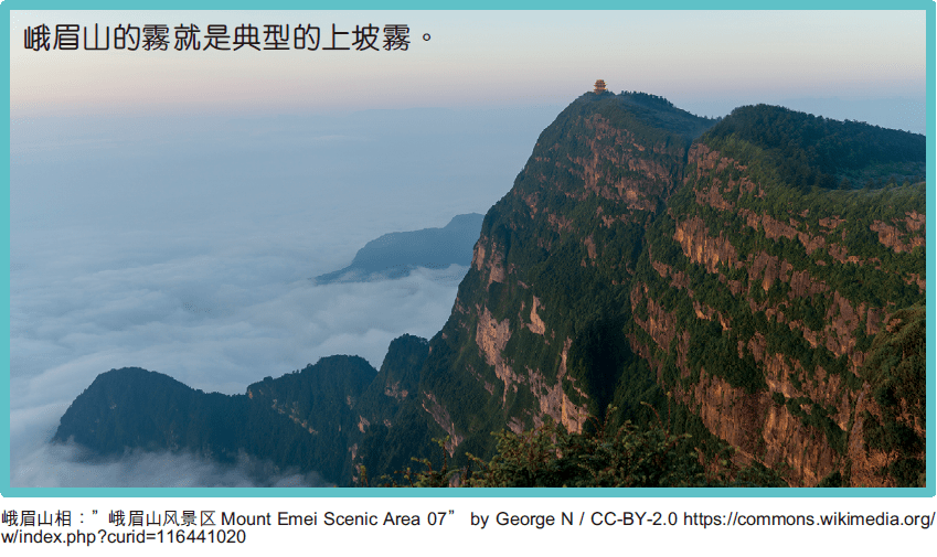 上坡雾只会在山中出现。当气流把空气吹向山坡的时候,空气沿山坡向上爬升。位置越高,温度越低。因此,空气中的水气冷却凝结,雾在山脚至山腰位置形成。