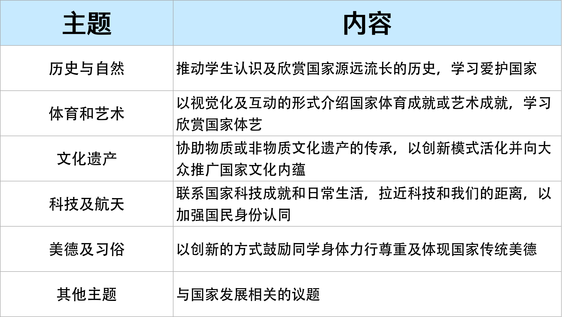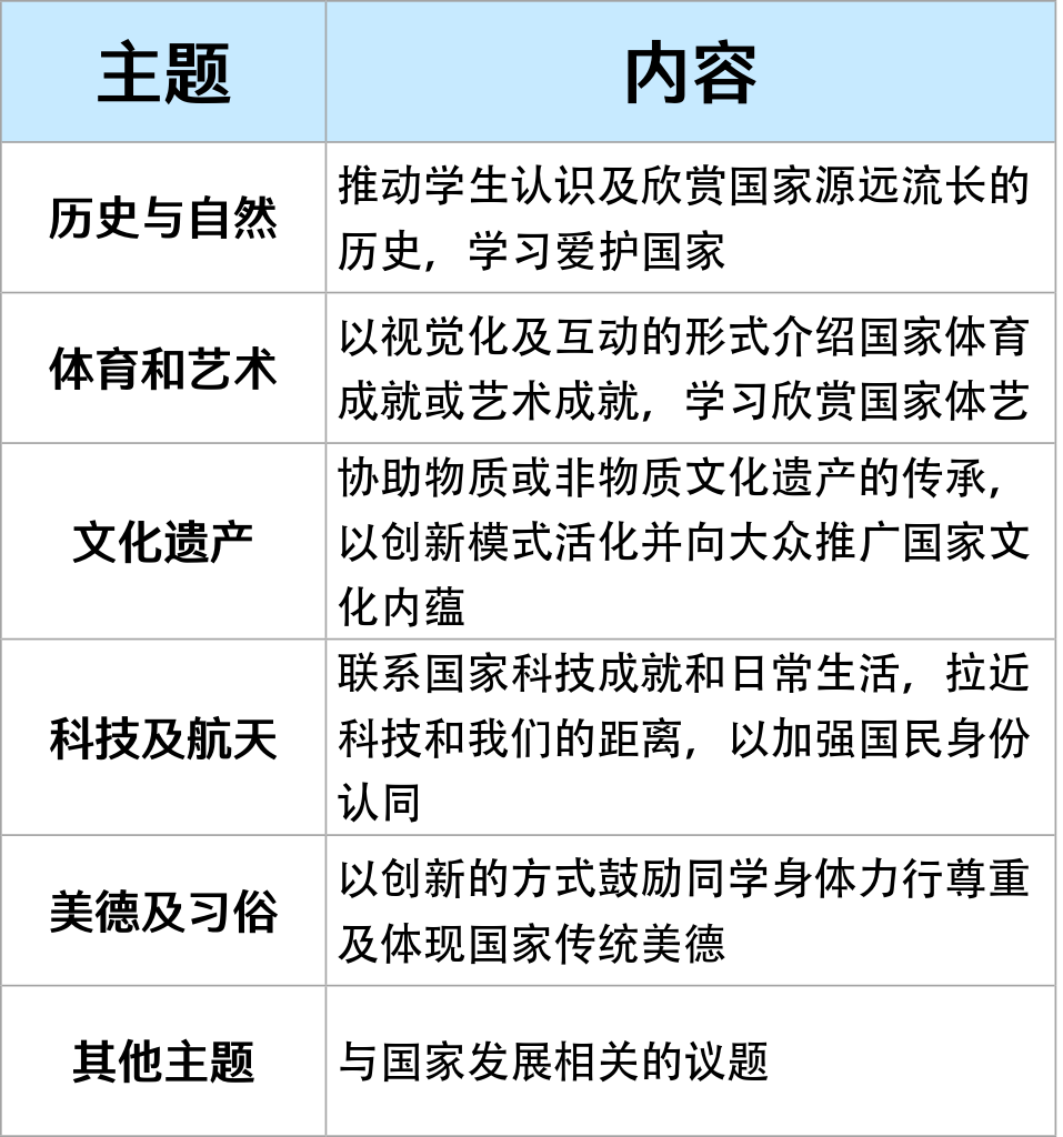 - 深化学生对祖国的认识,培养他们的国家观念、意识和提升国民身份认同。