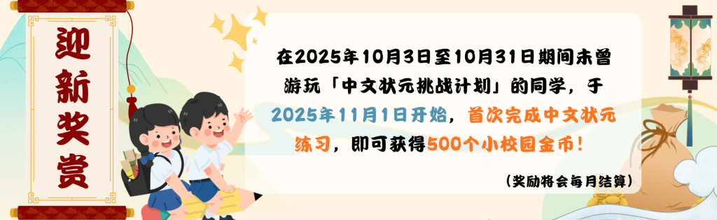 为鼓励更多新同学加入中文状元的学习行列,特别推出迎新奖赏: