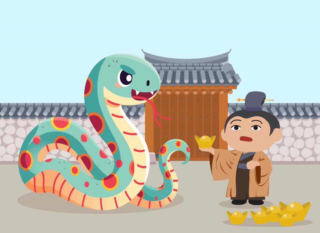 「人心不足蛇吞象」中的象不是大象,而是宰相的意思。傳說從前有一個農民,上山砍柴的時候遇見一條已凍得發僵的小蛇,動了惻隱之心,救了小蛇回家。過了一段日子,小蛇長大了。蛇為了報答農民救命之恩,便答應滿足農民的願望。農民提出要發大財的要求,蛇就讓他得到大批金銀財寶。農民得到財寶之後,卻進一步向蛇提出要當宰相,蛇也滿足了他。農民雖然已貴為宰相,卻並未因此而滿足,還要求蛇使他長生不老。蛇覺得他實在太過分,便一口把他吃掉。所以,蛇吞掉的是宰相,成為了「人心不足蛇吞相」,只是後來漸漸演變成「人心不足蛇吞象」。