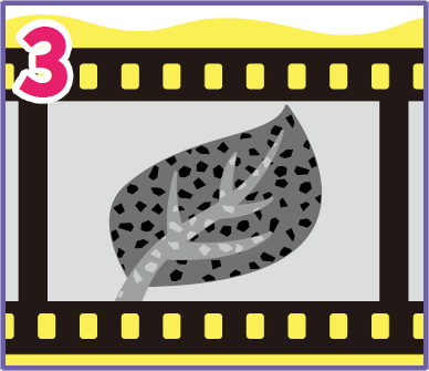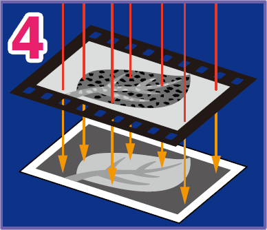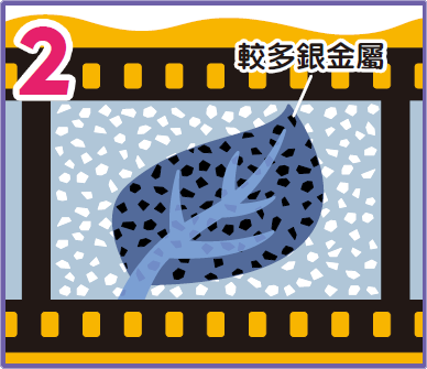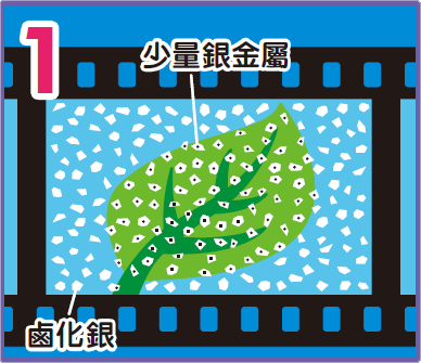 當按下相機快門拍攝上圖葉片時,外面的光穿過鏡頭,將樹葉影像直接照射到菲林上。菲林上的鹵化銀就會被曝光,產生化學作用,鹵化銀局部轉成黑色的銀金屬。接收光量越多,轉化的範圍越大。