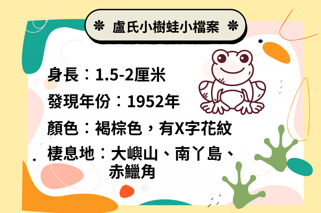 說起香港的獨有物種,相信許多人都聽說過盧氏小樹蛙。這小小的青蛙是全港23種青蛙和蟾蜍中最小的,平均身長只有1.5─2厘米,就如大家的拇指一樣大。小樹蛙的背部為褐棕色,隱隱約約帶有「X」字花紋,這樣的外表近似叢林環境,成為獨特的保護色,讓牠們難以被發現。
