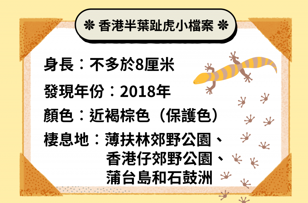 看完小樹娃,小校友再介紹一位迷你鄰居給大家認識,牠便是近年才被發現的香港半葉趾虎。半葉趾虎其實是壁虎的一種,這品種由香港浸會大學的生物研究團隊於2018年於薄扶林郊野公園、香港仔郊野公園、蒲台島和石鼓洲發現。香港半葉趾虎全長不多於8厘米,是香港所有壁虎物種中最小。小壁虎看起來十分迷你,但仔細觀察會發現其背部和尾巴的連結處上有橙色花紋,而尾巴上亦有深淺色橫間條紋,而牠們最大的特徵則是雙手的第一隻手指並沒有爪。