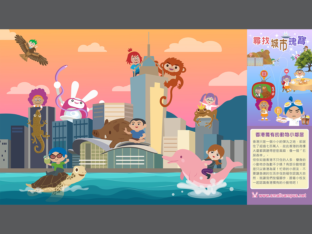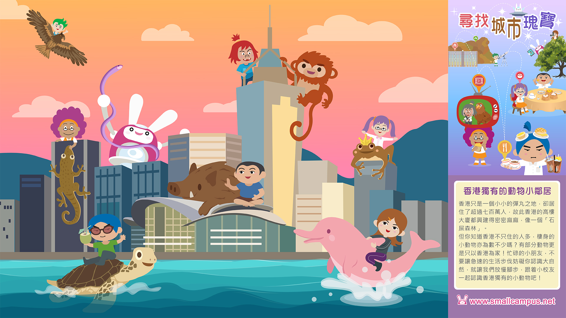 香港只是一個小小的彈丸之地,卻居住了超過七百萬人,故此香港的高樓大廈都興建得密密麻麻,像一個「石屎森林」。但你知道香港不只住的人多,棲身的小動物亦為數不少嗎?有部分動物更是只以香港為家!忙碌的小朋友,不要讓急速的生活步伐妨礙你認識大自然,就讓我們放慢腳步,跟着小校友一起認識香港獨有的小動物吧!