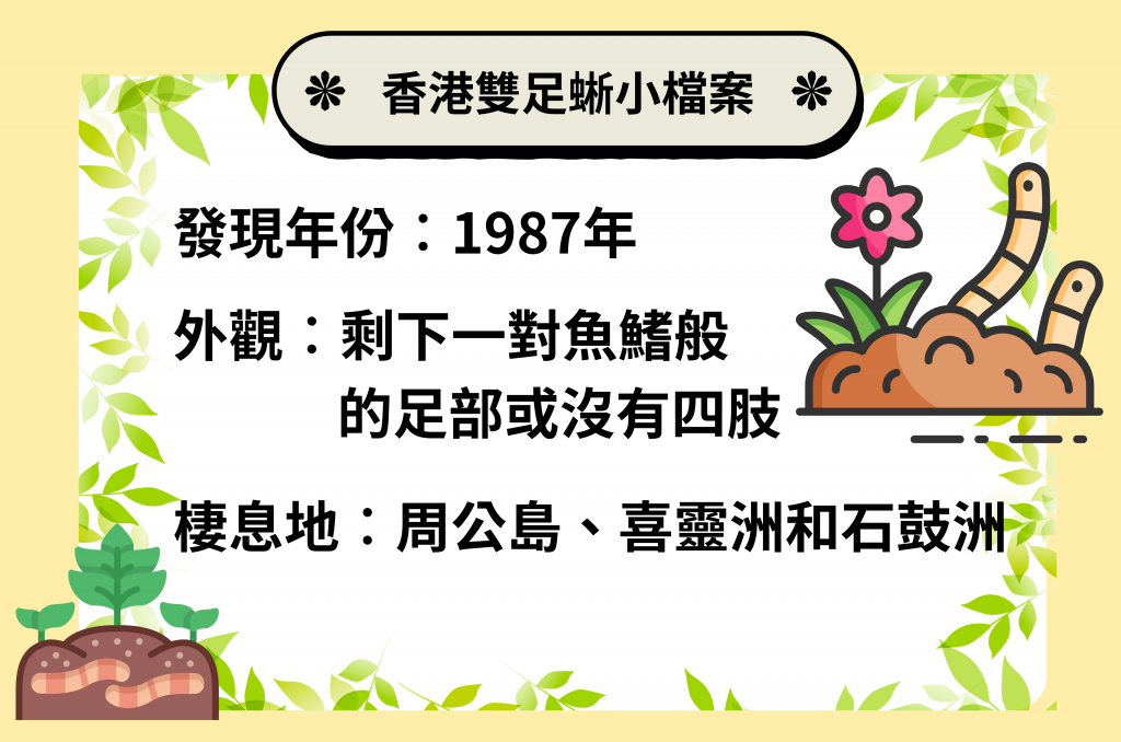 另一種香港特有的小動物名為香港雙足蜥。雖然分類上牠屬於蜥蜴,不過牠們的四肢早已因為長期居於地下而退化,令雄性的雙足蜥只剩下一對類似魚鰭般的足部,因此被命名為雙足蜥;而雌性的雙足蜥更是完全沒有四肢,就如同蛇類一樣呢!加上雙足蜥長期在泥土下生活,牠們的眼部也已經退化到視力盡失,只留下兩個小小的洞,所以不少人都誤以為雙足蜥為蚯蚓。