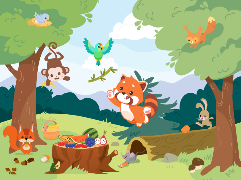 Animal friends had a food party in the forest. Before the party, they set out to find their favourite food on their own. The monkey swung from branch to branch, eagerly searching for juicy fruits. The squirrel ran along the tree trunks, quickly collecting various nuts. The parrot fluttered its wings, plucking ripe berries from the plants. The red panda skilfully climbed bamboo stalks, gathering the fresh and crunchy leaves.
