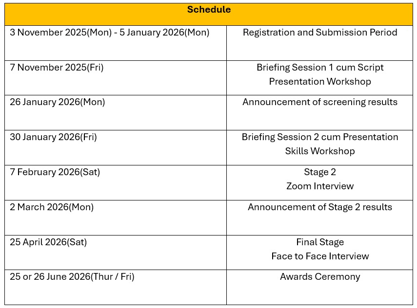 The first briefing session & script presentation workshop will be held on 7 November 2025 (Fri), from 4:00 to 5:00 PM. All interested students, teachers and parents are welcome to register.