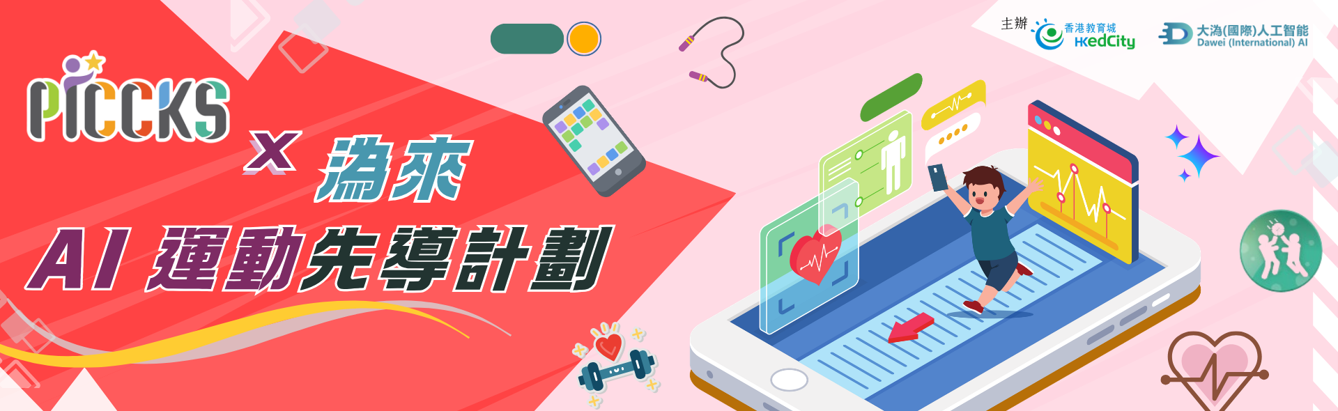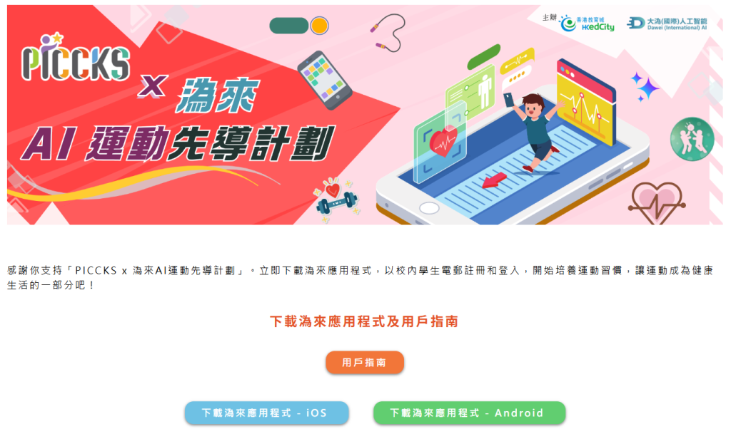 「PICCKS x 溈來AI運動先導計劃」由香港教育城(教城)與大溈(國際)人工智能科技有限公司攜手推動。計劃響應香港特別行政區政府「體重管理行動計劃」的號召,透過「溈來」應用程式內的鏡頭感測及人工智能(AI)動作識別技術,即時分析使用者的運動表現,計算體重指標(BMI),並自動記錄運動次數及能量消耗。