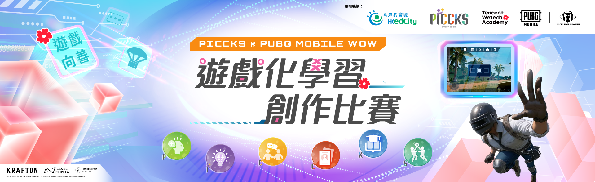 由香港教育城與騰訊合辦的「PICCKS x PUBG MOBILE WOW遊戲化學習創作比賽」,旨在鼓勵學生運用WOW數字平台發揮創意,設計實用且蘊含科技向善理念的遊戲化學習方案,增進使用者的知識和對社會議題的關注,從而啟發學生探索數字學習的潛能,並將學習融入遊戲中,用科技創造正向價值,提升學習成效及促進全人發展,為現實世界帶來正向改變。