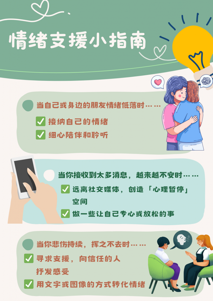 不必强作坚强,把所有情绪藏在心里。与信任的家人、好友、老师,或者学校社工保持联系,抒发感受。如果不知从何说起,辅导心理学家黄杏琳也提议可以通过制作心意卡、写信或折纸鹤等形式,把情绪转化出来。
