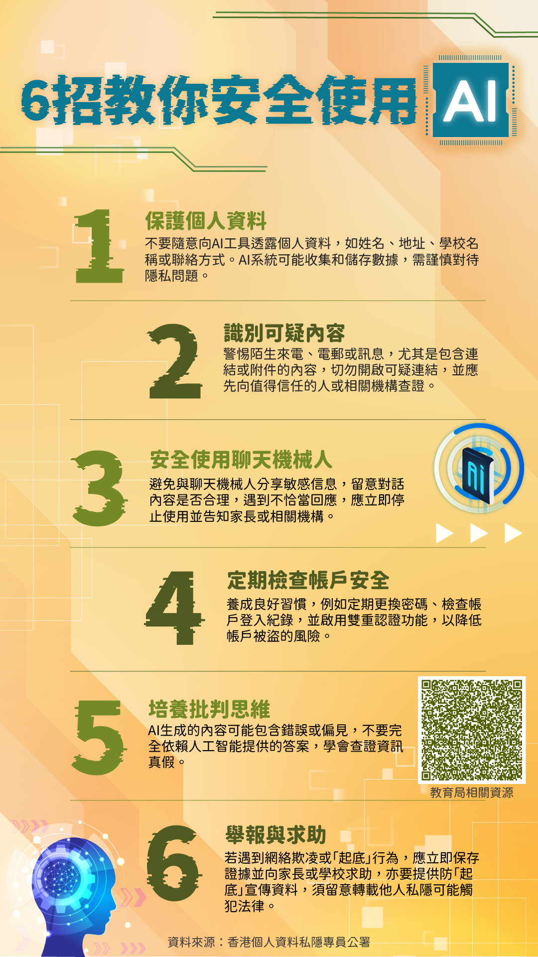 人工智能為學習和生活帶來便利,但安全使用是關鍵。教城綜合了香港個人資料私隱專員公署的建議,為大家準備安全使用AI六招,讓大家在數碼時代中健康成長的同時,可以保護隱私與安全。