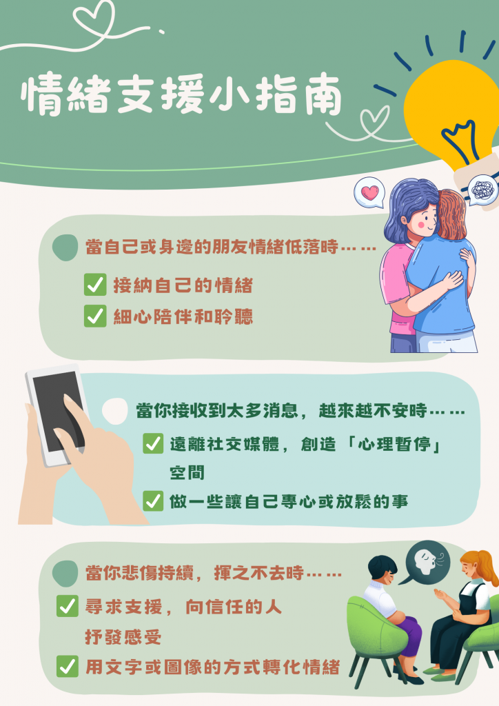 讓我們一起學習照顧自己,也學習互相關懷,並肩走過難關。如需要更多的傾談和支持,可致電24小時精神健康支援熱線:18111。